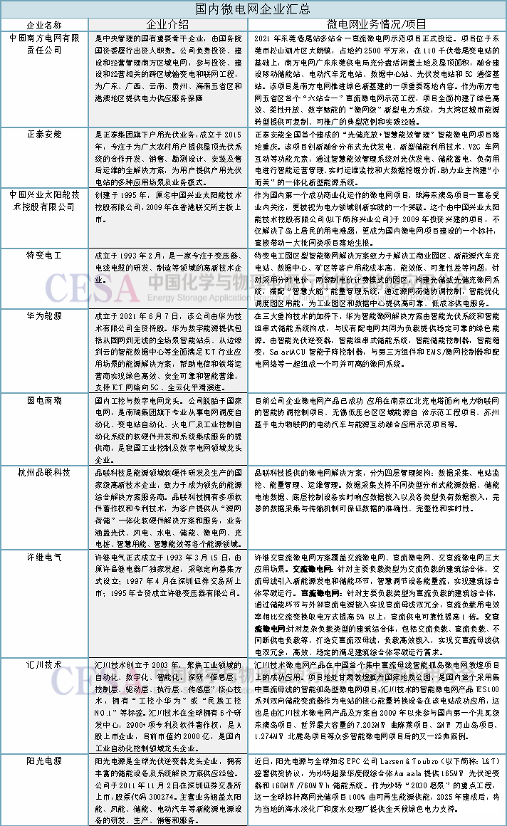下图展示了部分在国内微电网领域布局的主要企业。可以看到,在国家资金的支持下,国有企业成功打开了微电网市场,并为后续的发展奠定了基础。随后,众多民营企业迅速跟进,凭借各自行业的领先优势,进一步推动了微电网技术的提质升级。特变电工、蜂巢能源、林洋能源、汇川技术等企业在储能领域的卓越表现,使其成为了这一领域的佼佼者。