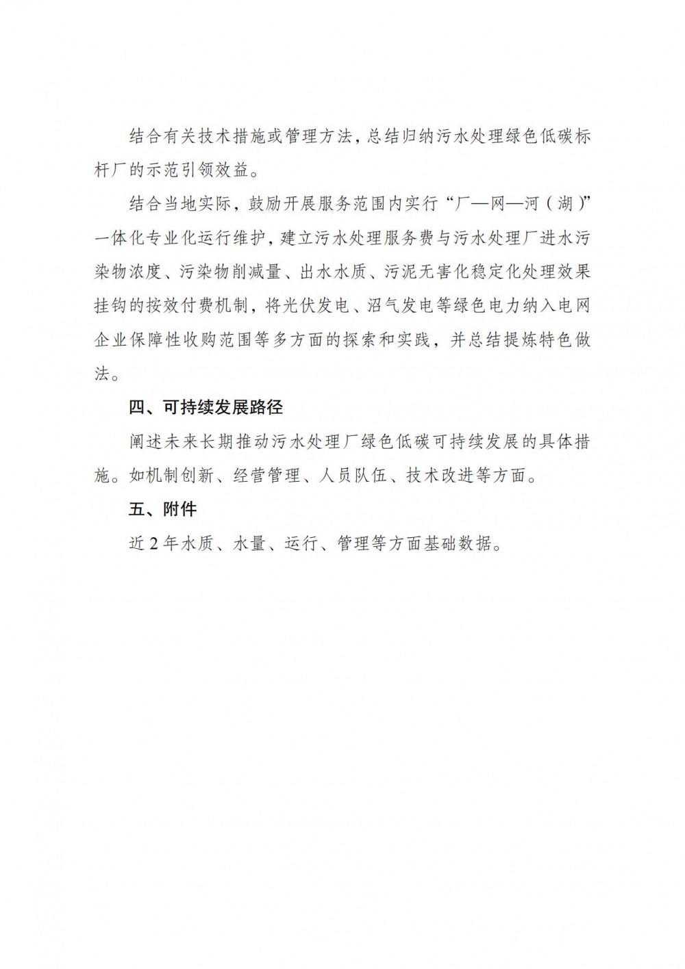 结合当地实际,鼓励开展服务范围内实行“厂—网—河(湖)”一体化专业化运行维护,建立污水处理服务费与污水处理厂进水污染物浓度、污染物削减量、出水水质、污泥无害化稳定化处理效果挂钩的按效付费机制,将光伏发电、沼气发电等绿色电力纳入电网企业保障性收购范围等多方面的探索和实践,并总结提炼特色做法。