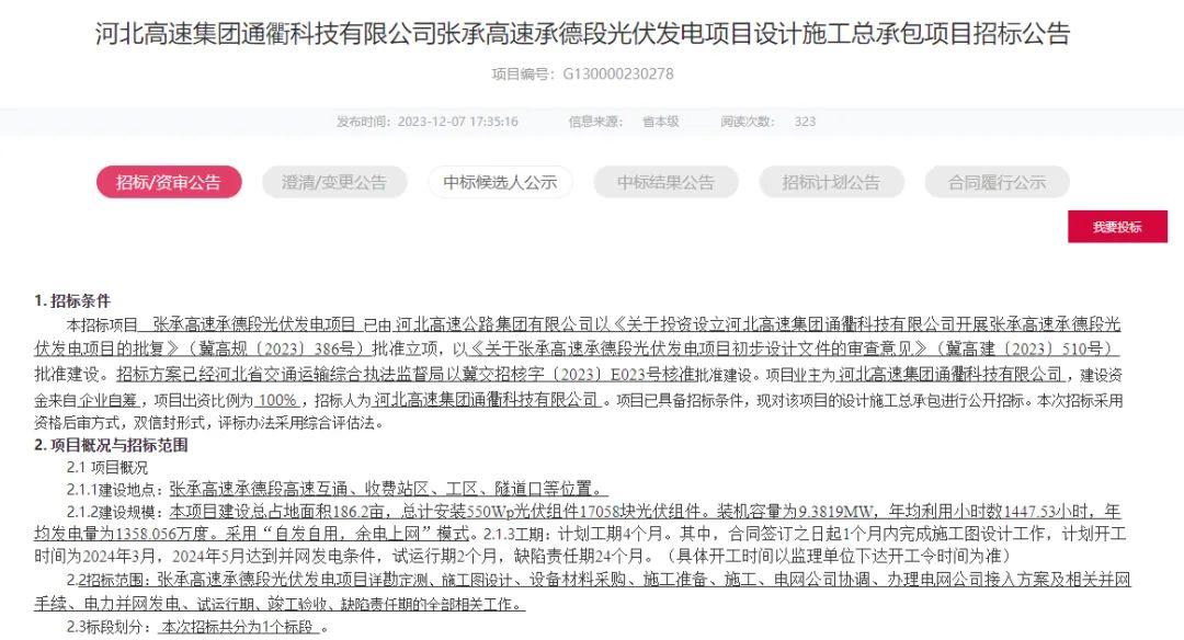此前,四川省交通运输厅宣布了一项重要举措,即加速推进“绿色电力自给自足”项目,旨在全省36条高速公路沿线部署分布式光伏发电设施,并配套建设储能系统,其容量不低于总装机容量的20%,以确保能源的有效存储与利用。 具体规划方面,四川已明确在包括雅西、泸黄、西攀在内的21条已运营高速公路上,规划安装光伏设备总装机容量达到47兆瓦,预计年发电量可达6万兆瓦时,为这些繁忙的交通干线提供绿色能源支持。同时,对于沿江高速公路宜金段、九棉、久马等15条正在建设中的高速公路,也规划了更为宏大的光伏装机规模,总计73兆瓦,预计年发电量将攀升至9万兆瓦时,进一步推动四川高速公路网的绿色转型与可持续发展。 实际上,交通运输业作为关键的“碳足迹”贡献者之一,其排放量在我国碳排放总量中占据了约10.4%的比重。与欧美国家相比,我国交通运输行业的碳排放展现出独特的态势:占比相对较低,但增长速度迅猛,同时蕴含着巨大的减排潜力。尤为值得关注的是,公路运输在这一领域内占据了主导地位,其碳排放量占全国交通运输碳排放总量的85%以上,无疑是减排工作的重中之重和首要目标。因此,推动公路行业向低碳化、绿色化转型,对于实现我国整体碳减排目标具有不可估量的重大意义。 近年来,得益于国家及地方政府层面出台的一系列积极政策与激励措施,国内众多省份的交通集团积极响应号召,纷纷成立或转型为专注于新能源领域的企业,旨在通过技术创新和模式升级,为交通运输行业的绿色可持续发展贡献力量。 “光伏+高速”这一创新模式巧妙融合了光伏发电技术与高速公路系统,通过充分挖掘高速公路沿线的宝贵空间资源——包括公路占地、路肩、匝道、隔离带等开放区域,以及服务区内的建筑屋顶、停车棚顶面、围墙等可利用设施,部署安装高效的光伏发电系统。这些系统产生的绿色电力不仅可以直接供给桥隧的照明与通风系统、服务区等各类公路用电设施,减少对传统能源的依赖,还能将多余电力并网输出至电网系统,实现能源的最大化利用。 此模式不仅确保了高速公路边坡结构的完整性和交通运行的安全性不受影响,还极大地提升了闲置资源的价值,展现了新能源与道路交通领域之间的和谐共生与高效协同。正因其在促进节能减排、优化能源结构方面的显著成效,近年来“光伏+高速”模式受到了广泛的关注与推广,成为推动绿色低碳交通体系构建的重要力量。 一、政策支持 “十四五”以来,从国家到省级支持政策频出,主管部门也正在酝酿发布分布式光伏+交通的专项支持政策。2022年1月18日,国务院下发《“十四五”现代综合交通运输体系发展规划》明确指出,鼓励在交通枢纽场站以及公路、铁路等沿线合理布局光伏发电设施。 2024年2月,交通运输部印发《2024年全国公路服务区工作要点》中明确,围绕“双碳”目标,落实交通运输领域和公路行业绿色低碳发展有关工作要求,推动近零碳服务区建设,推进服务区光伏基础设施建设。 除了国家层面的政策支持,包括江苏、山东、四川、河北等省级文件也连续发文支持交通领域拓展分布式光伏应用。 2023年5月,山东省交通运输厅发布《2023年全省交通运输工作要点(工作计划)》,指出,加快绿色交通基础设施建设,完善新能源、清洁能源在交通领域的布局和应用,推动交通网、能源网融合发展,鼓励在交通枢纽场站以及公路、铁路等沿线合理布局光伏发电及储能设施,推广高速公路边坡光伏发电应用,全面推进“零碳”高速公路服务区试点建设。 二、光伏+高速项目招标 2023年11月24日,山西交控新能源发展有限公司正式启动了山西省高速公路200MW分布式光伏发电项目的EPC总承包工程公开招标程序。此次招标活动标志着该项目进入实质性建设准备阶段。 据官方消息透露,该项目的招标主体为山西交控新能源发展有限公司,项目所需的建设资金已全部由企业自行筹集,出资比例高达100%,彰显了企业对项目实施的坚定决心和充足财力支持。 项目规划在山西交控集团直接管理的各条高速公路运营公司及服务区管理公司所管辖的收费站、服务区等适宜区域,广泛布局分布式光伏电站。这些电站将采用多样化的建设形式,包括但不限于地面(坡面)光伏系统(配备固定支架或柔性支架)、屋顶光伏系统以及车棚光伏系统等,以最大化利用空间资源,提升发电效率。 项目初步设定的总装机容量为200.10475万千瓦(即200MW),规模宏大,旨在通过光伏发电这一清洁能源方式,为高速公路系统提供稳定可靠的绿色电力支持。项目预计的建设周期为12个月,即从启动建设到全面完成并投入运营,将高效推进,确保项目按时按质完成。 2023年12月7日,河北高速集团通衢科技有限公司张承高速承德段光伏发电项目设计施工总承包项目公开招标。 本项目的招标方为河北高速集团通衢科技有限公司,其资金筹措方式与前述项目相似,即全部建设资金由企业自行筹集,出资比例高达100%,展现了企业的强大实力和对项目的充分信心。 项目规划在张承高速公路承德段的关键位置,包括高速互通、收费站区、工区及隧道口等区域,共占用土地面积186.2亩,旨在这些区域安装高效的光伏发电系统。该系统将采用总计17058块、每块功率为550Wp的光伏组件,总装机容量达到9.3819兆瓦(MW)。 基于对项目所在地光照条件的深入分析与预测,项目