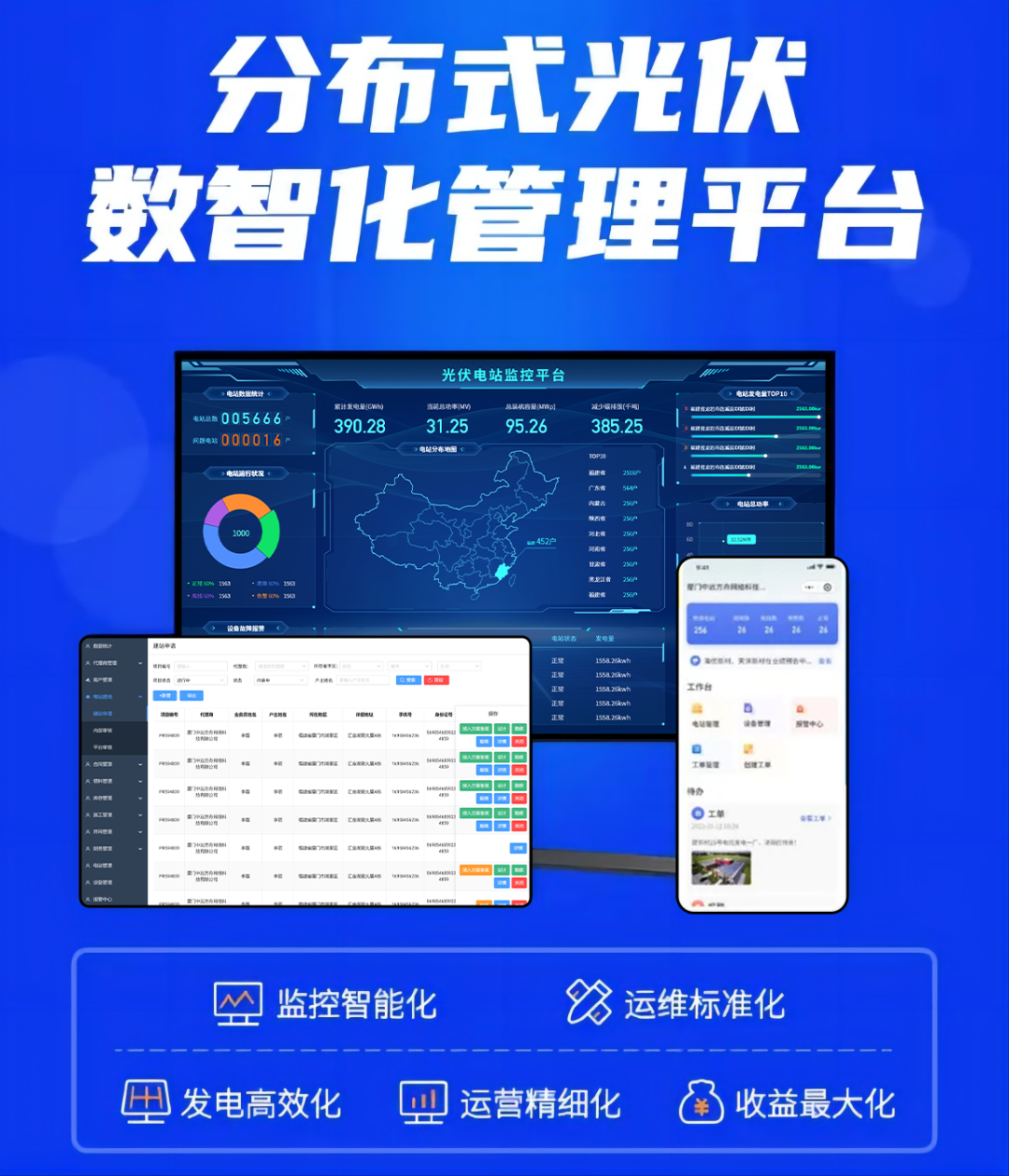 整合分布式电站业务、工程、运维管理方法,并集合主流互联网、物联网、大数据技术,为客户提供专业、智能、高效的业务管理体系和数字化管理平台工具。