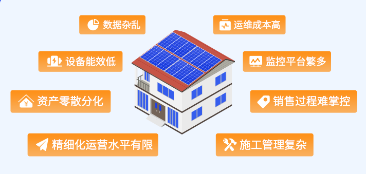 分布式光伏——一个多主体、碎片化的下沉市场,目前存在五大痛点:业务开展难、进度把控难、业务协同难、财务结算难、设备监控难。