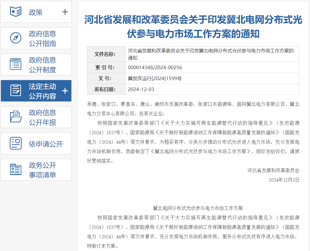 12月3日,河北省发展和改革委员会发布关于印发冀北电网分布式光伏参与电力市场工作方案的通知,为服务分布式光伏健康发展,健全配套政策与市场机制,按照“试点先行、分批推进、全面入市”的原则,分阶段推动分布式光伏参与市场。