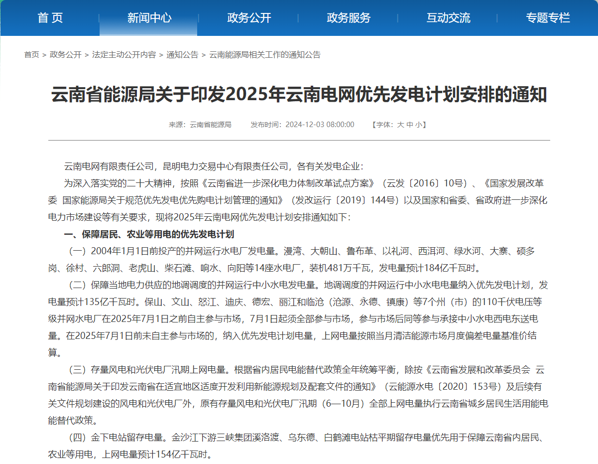 云南省2025年优先发电计划发布