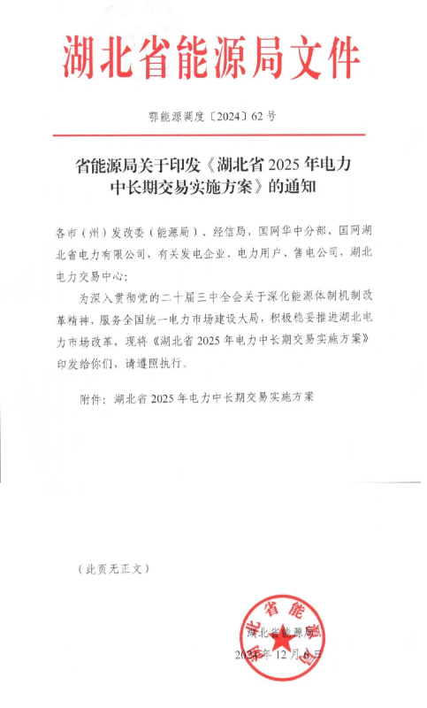 12月6日,湖北省能源局发布《湖北省2025年电力中长期交易实施方案》,对风电、光伏项目入市的具体要求如下。