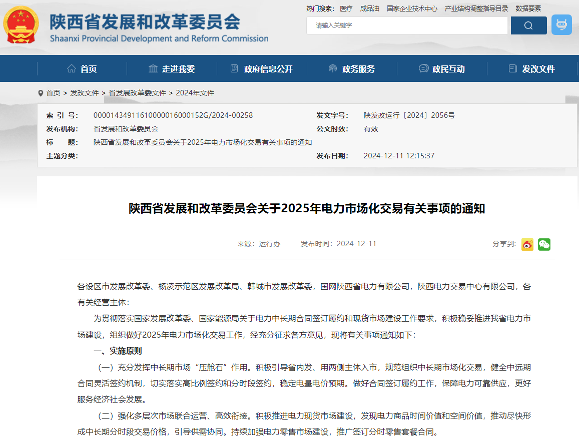 12月11日,陕西发改委发布《关于2025年电力市场化交易有关事项的通知》(简称“通知”)。