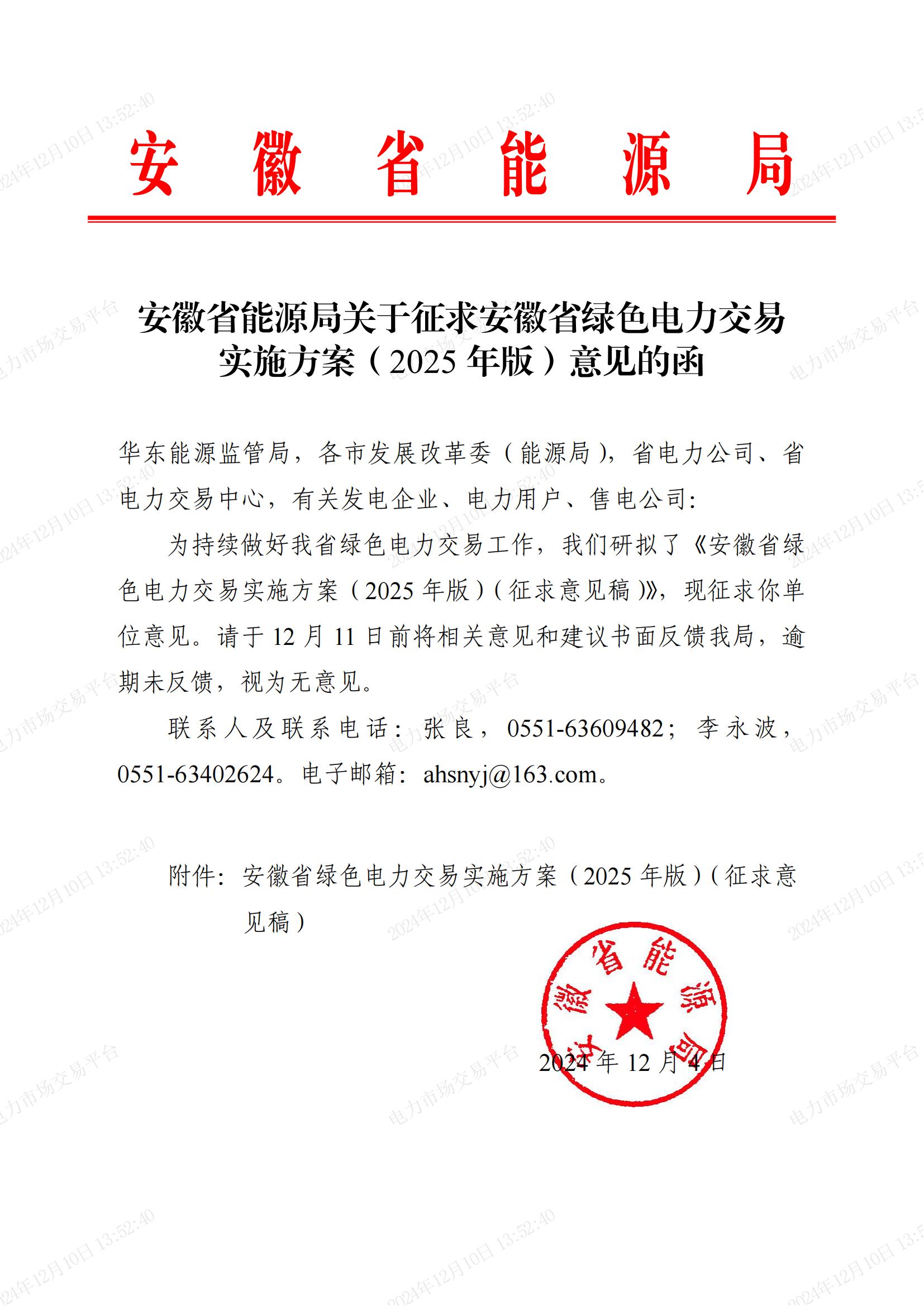 12月5日,安徽省能源局发布《关于征求安徽省绿色电力交易实施方案(2025年版)意见的函》。文件指出,新能源发电企业方面,平价集中式上网的风电和光伏发电企业、2025年1月1日以后备案的“全额上网”和“自发自用,余量上网”的平价工商业、非自然人户用分布式光伏发电企业原则上均应参与绿色电力交易(以下简称绿电交易);鼓励其他平价工商业、非自然人户用分布式光伏发电企业参与交易;自然人户用分布式光伏暂不参与交易。