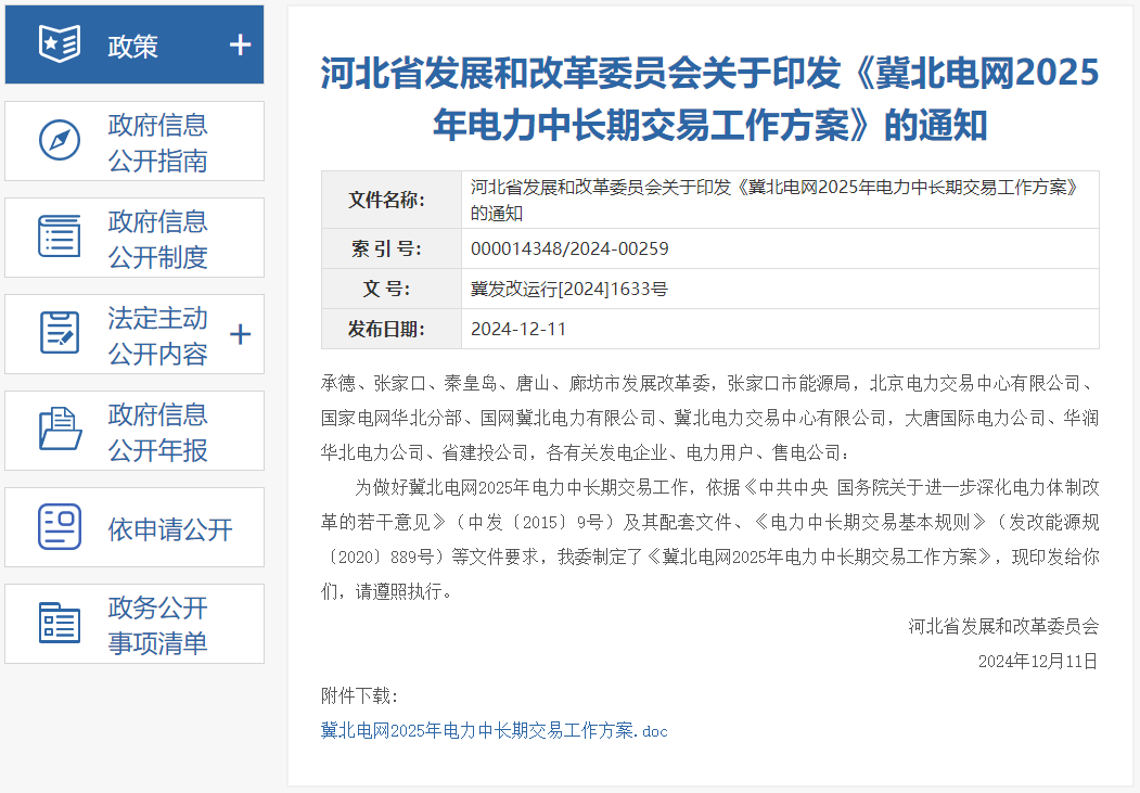 12月11日,河北省发展和改革委员会发布关于印发《冀北电网2025年电力中长期交易工作方案》的通知,根据预测,冀北电网2025年电力中长期直接交易电量规模暂定为830亿千瓦时,根据直接交易用户实际交易需求适时调整。