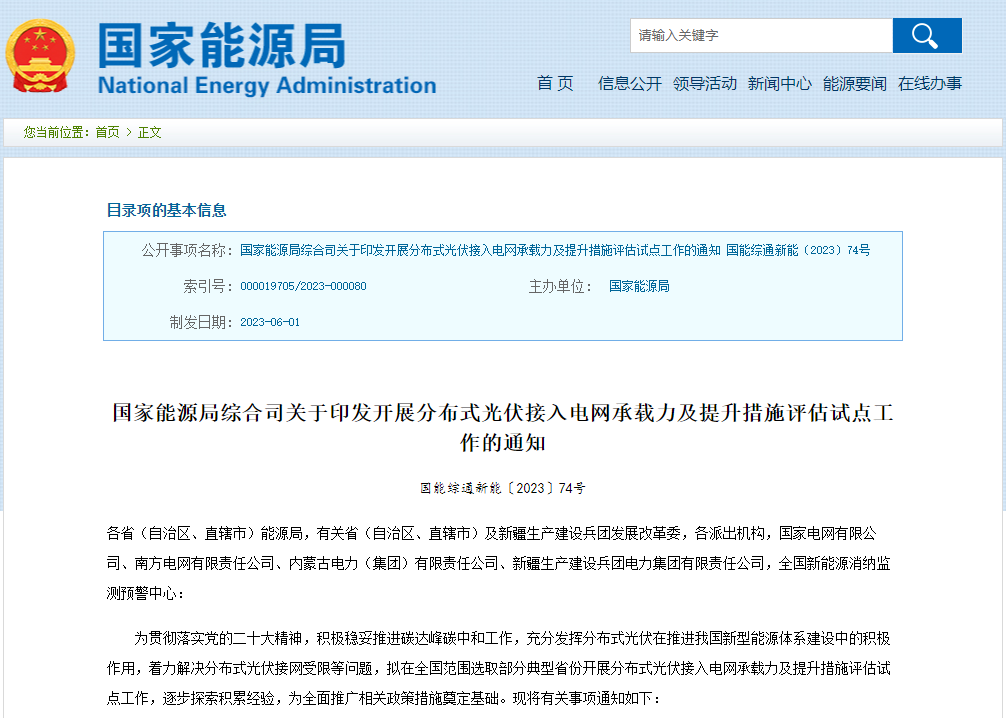 为贯彻落实党的二十大精神,积极稳妥推进碳达峰碳中和工作,充分发挥分布式光伏在推进我国新型能源体系建设中的积极作用,着力解决分布式光伏接网受限等问题,拟在全国范围选取部分典型省份开展分布式光伏接入电网承载力及提升措施评估试点工作,逐步探索积累经验,为全面推广相关政策措施奠定基础。现将有关事项通知如下: