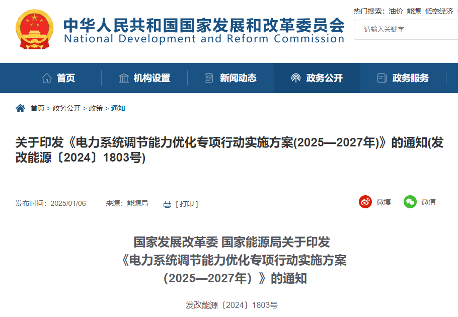 1月6日,国家发展改革委、国家能源局印发《电力系统调节能力优化专项行动实施方案(2025—2027年)》的通知。