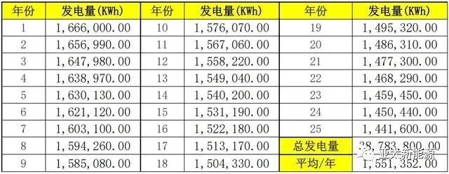 项目建成后25年的运营期内,依据国家规定组件效率的衰减标准,理论预测项目每年发电量情况如下表:
