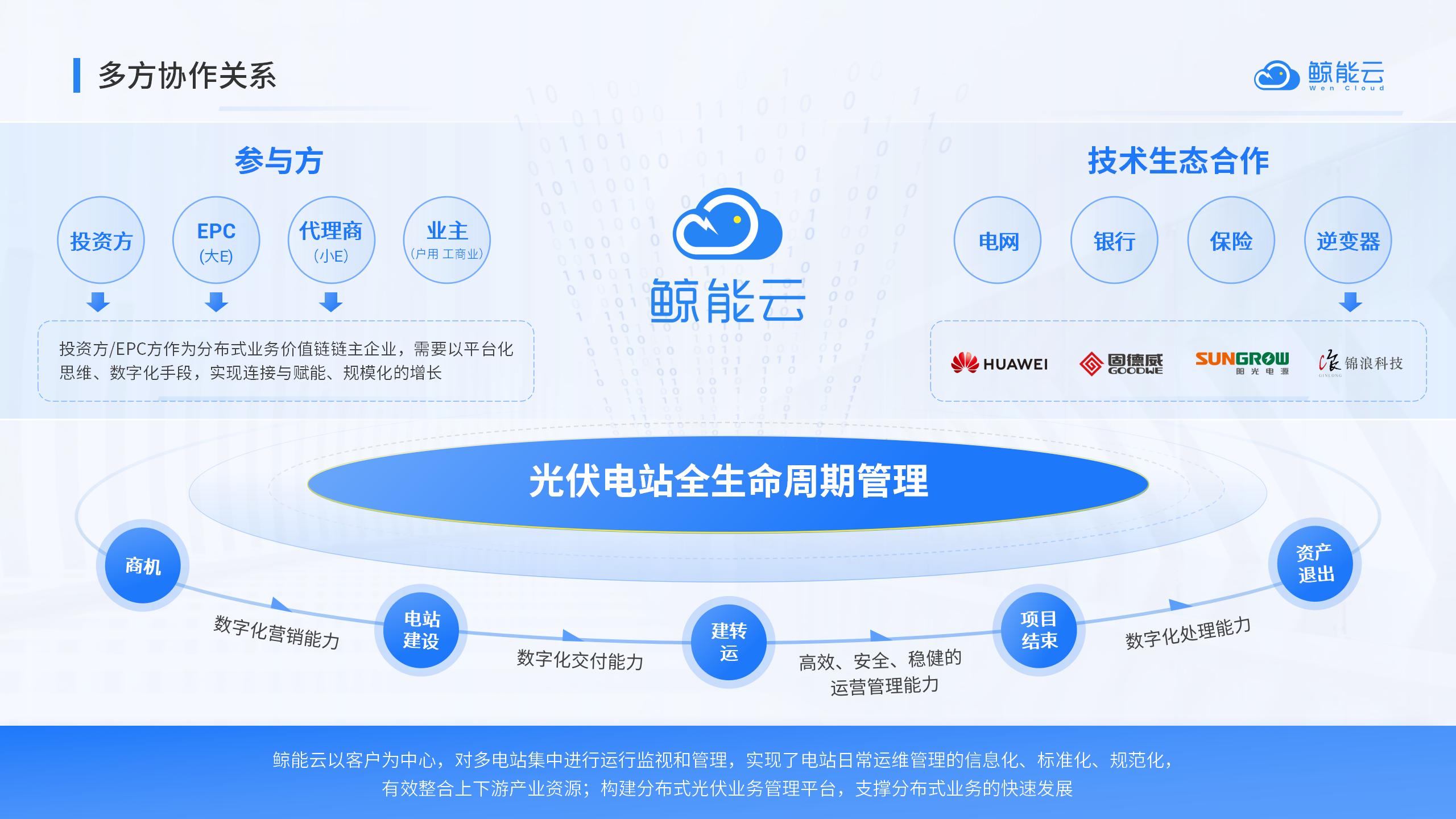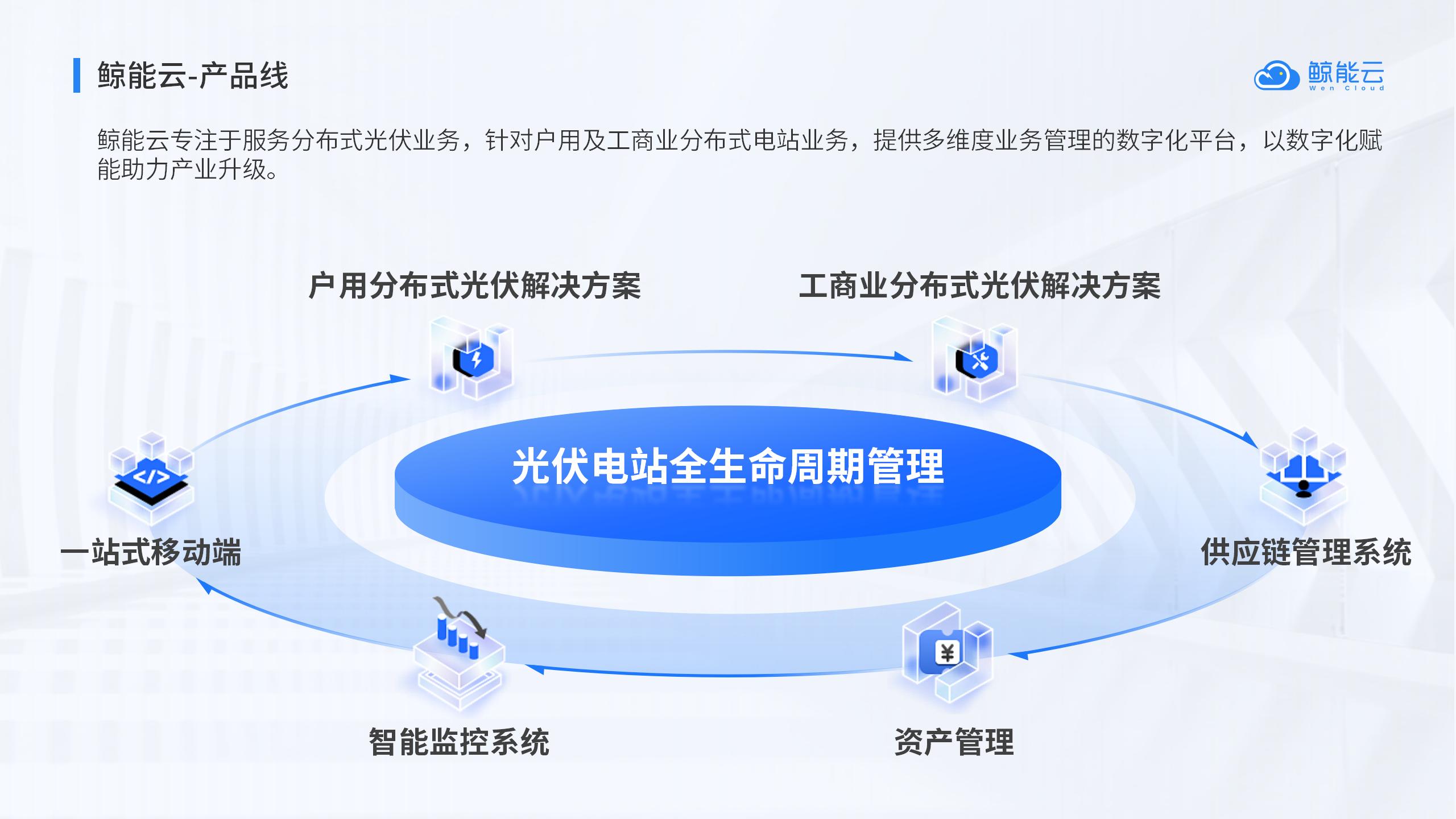 鲸能云专注于服务分布式光伏业务针对户用及工商业分布式电站业务,提供多维度业务管理的数字化平台,以数字化赋能助力产业升级。