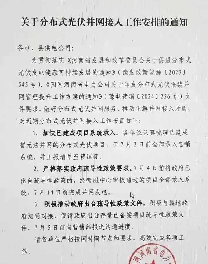 分布式光伏备案并网, 三省政策相继松绑! 一、江西:不得无故不备案、暂停备案或擅自增加前置条件! 7月3日,江西省能源局下发《关于做好屋顶分布式光伏项目备案和并网服务工作的通知》(以下称“通知”),针对目前分布式市场存在的停止备案、并网周期长等问题做进一步说明!“通知”明确: 各级备案机关不得无故不备案、暂停备案或擅自增加前置条件。接网消纳存在风险的地区,可作风险提示。 电网企业受理消纳意见申请不应设置前置条件,对经过充分论证,采取“四可”、配置调节手段、集中汇流等多种措施后仍无法并网的,可明确注明采取“四可”、配置调节手段、集中汇流等多种措施后仍无法并网。 二、河南:存量未并网分布式,7月14日前全部并网发电! 近日,国网河南省电电力公司营销部也正式发布了《关于分布式光伏并网接入工作安排的通知》(以下称“通知”),要求做好分布式光伏并网服务,推动化解并网接入矛盾。 “通知”对近期分布式光伏并网接入工作布置如下: 1、加快已建成项目系统录入。各单位认真梳理已建成暂无法并网的分布式光伏项目,于7月2日前全部录入营销系统,并上报清单至营销部。 2、严格落实政府疏导性政策要求。7月4日前将政府已出台疏导性政策的,经营服中心审核通过的项目全部录入系统,7月14日前完成并网发电。 3、积极推动政府出台疏导性政策文件。积极与属地政府沟通对接,促请政府出台存量已备案项目疏导性政策文件,7月5日前向营销部报送沟通进度。 三、四川:分布式光伏备案无需取得电力消纳意见! 此前,6月15日,四川发改委、四川省能源局联合发布《关于做好分布式光伏开发建设有关事项的通知》,通知明确: 一、规范分布式光伏备案工作 1、分布式光伏备案无需取得电力消纳意见。停止执行《关于加强和规范分布式光伏发电项目建设管理的通知》“纳入建设规模指标管理的分布式光伏项目备案时应出具电网企业电力消纳意见”“单个项目在2MW以下的由市(州)电网企业出具消纳意见,2MW及以上、20MW以下的由省级电网企业出具消纳意见”的规定。 2、对于设置分布式光伏备案前置条件的地区,有关市(州)能源主管部门应立即组织开展自查自纠,即时整改,不得擅自增减分布式光伏备案审查条件。 二、做好分布式光伏接网工作 1、电网企业应结合分布式光伏发展需求,有针对性加强配电网建设,配套完善电网稳定运行手段,保障电能质量。要统筹配电网容量、负荷增长及调节资源,系统开展新能源接网影响分析评估配电网承载能力,建立可承载新能源规模的发布和预警机制。 2、分布式光伏项目备案后,项目单位应及时向电网企业提出并网接入申请。电网企业要优化工作流程,提高办理效率,做好并网管理相关工作。
