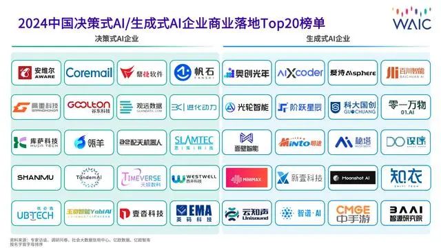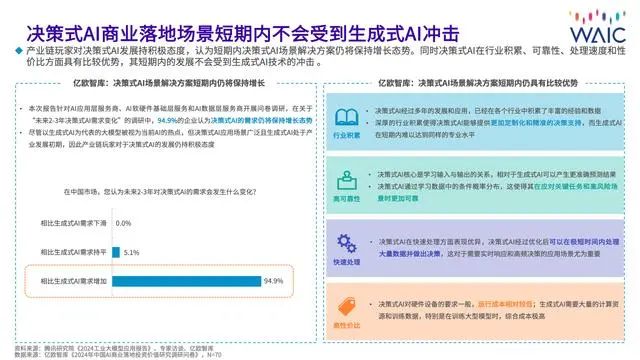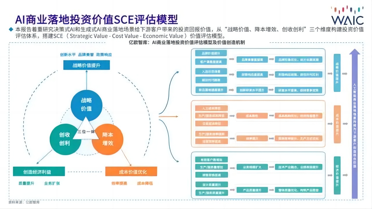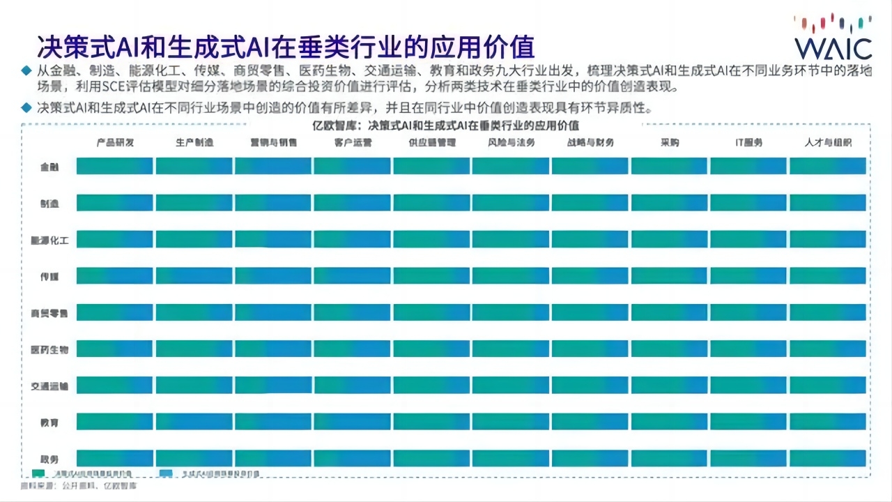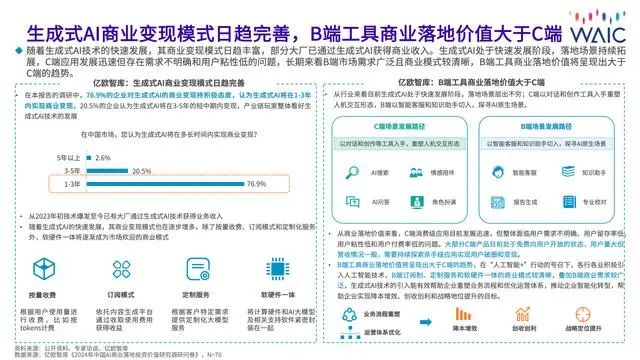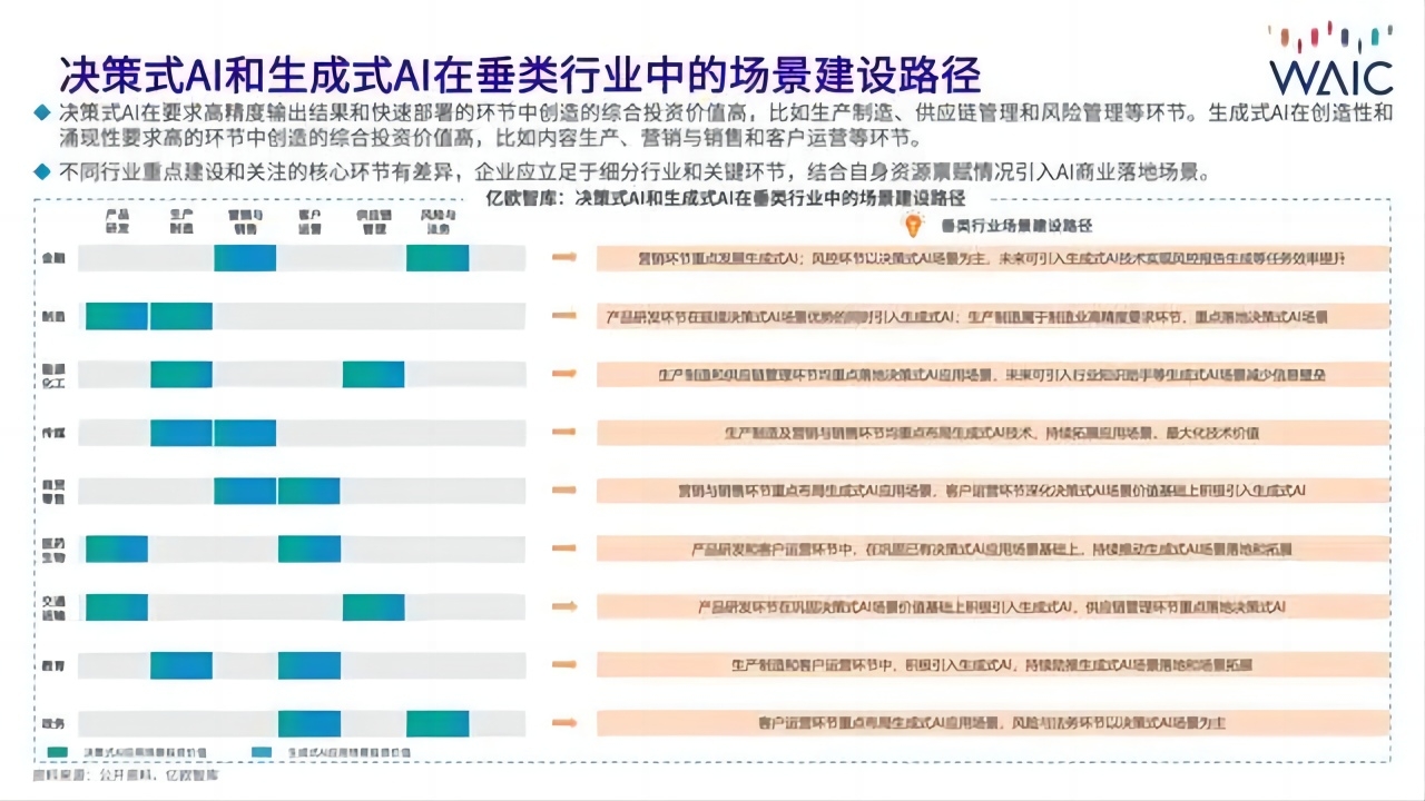 2024年7月6日下午,2024世界人工智能大会“AI商业落地论坛”成功举办。本场论坛由世界人工智能大会组委会办公室指导;亿欧主办;上海市工商联数字经济商会、上海市数商协会、上海市信息服务业行业协会、上海市人工智能行业协会、上海市工业互联网协会、上海金融信息行业协会、“一带一路”信息产业发展联盟协办;上海蓝天经济城、滴普科技、玉贲智能、光本位和实在智能共同支持。 亿欧联合创始人兼总裁王彬围绕《新质生产力发展背景下,人工智能在B端工具的商业落地价值远大于C端应用》进行主题分享,并正式发布《2024中国AI商业落地投资价值研究报告–论决策式与生成式AI在垂类行业的应用价值》报告。 一、新质生产力背景下“赋能百业”比“百模大战”更有商业落地价值 通用大模型历经创业爆发期,目前正处于“百模大战”深水区。预计2025 – 2026年市场逐渐出清,优势企业坚守战场,剩余企业陆续退出竞争。2027 – 2028年预计通用大模型市场将呈现寡头竞争格局,3 – 5家厂商成为中国大模型生态的底层基座。2025 – 2028年通用大模型格局逐渐趋于稳定,垂类赛道会涌入一批通用领域转型的玩家,应用市场生态持续繁荣,大模型持续赋能千行百业发展。 二、AI商业落地投资价值SCE评估模型 人工智能从诞生至今历经三次发展浪潮,随着算力和数据的倍数增长,目前处于人工智能高速发展的第三波浪潮阶段,第三次浪潮时期的显著特征为决策式AI和生成式AI两条技术路径并行。今年的报告着重研究决策式AI和生成式AI商业落地场景给下游客户带来的投资回报价值,从“战略价值、降本增效、创收创利”三个维度构建投资价值评估体系,搭建SCE( Strategic Value - Cost Value - Economic Value )价值评估模型。 三、决策式AI和生成式AI在垂类行业的应用价值 从金融、制造、能源化工、传媒、商贸零售、医药生物、交通运输、教育和政务九大行业出发,梳理决策式AI和生成式AI在不同业务环节中的落地场景,利用SCE评估模型对细分落地场景的综合投资价值进行评估,分析两类技术在垂类行业中的价值创造表现。决策式AI和生成式AI在不同行业场景中创造的价值有所差异,并且在同行业中价值创造表现具有环节异质性,比如在传媒行业中,生成式AI在内容生产、营销和客户运营环节中创造的价值均高于决策式AI。 四、决策式AI和生成式AI在垂类行业中的场景建设路径 不同行业重点建设和关注的核心环节有差异,企业应立足于细分行业和关键环节,结合自身资源禀赋情况引入AI商业落地场景。比如传媒行业中,生产制造及营销与销售环节均重点布局生成式AI技术,持续拓展应用场景,最大化技术价值;医药生物行业中,产品研发和客户运营环节中,在巩固已有决策式AI应用场景基础上,持续推动生成式AI场景落地和拓展。 五、四类榜单发布洞察AI产业现状 以场景评价为基础,结合基于营收、业务增速、核心环节场景覆盖情况、场景落地能力等指标,评选出《2024中国综合类AI企业商业落地Top30榜单》、《2024中国决策式AI企业商业落地Top20榜单》、《2024中国生成式AI企业商业落地Top20榜单》和《2024中国AI企业商业落地基础设施服务商Top20榜单 》。 六、决策式AI商业落地场景短期内不会受到生成式AI冲击 本次报告针对AI服务商开展问卷调研,在关于“未来2-3年决策式AI需求变化”的调研中,94.9%的企业认为决策式AI的需求仍将保持增长态势,产业链玩家对决策式AI发展持积极态度。同时决策式AI在行业积累、可靠性、处理速度和性价比方面具有比较优势,增加了其应对生成式AI挑战的能力。 七、生成式AI商业变现模式日趋完善,B端工具商业落地价值大于C端 随着生成式AI技术的快速发展,其商业变现模式日趋丰富,部分大厂已通过生成式AI获得商业收入,在本报告的调研中,76.9%的企业认为生成式AI将在1-3年内实现商业变现。生成式AI处于快速发展阶段,落地场景持续拓展,C端应用发展迅速但存在需求不明确和用户粘性低的问题,长期来看B端市场需求广泛且商业模式较清晰,B端工具商业落地价值将呈现出大于C端的趋势,为下游客户创造战略、成本和经济价值。 八、语料数据是发展人工智能的基础要素 从传统人工智能三驾马车理论来说,语料数据一直是作为“天花板”存在,决定AI能力上限,随着市场预期的不断拔高,用于训练的数据正在往半结构、非结构化数据蔓延。数据的多样性和数量对于大模型的表现至关重要,因为大模型需要大规模的高质量数据进行训练,以提高其理解和生成语言的能力。 九、传统非结构化数据正在通过结构转化投入大模型开发 传统非结构化数据正在通过语料数据服务商进行结构转化,一些传统被认为比较难进行利用的数据,比如视频、音频、突发事件记录、物体形态变化数据等被投入到大模型开发,这是由于人工智能正在往AGI通用智能进行发展,通用人工智能需要强大的泛化力。