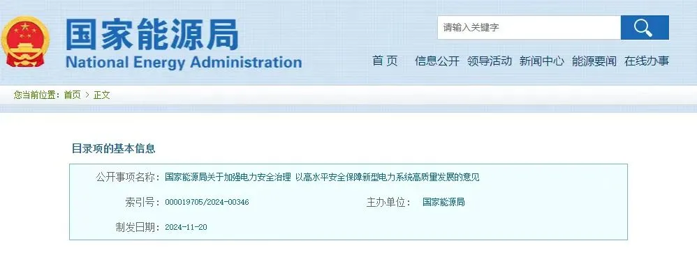 11月27日,国家能源局关于加强电力安全治理 以高水平安全保障新型电力系统高质量发展的意见,其中提到: