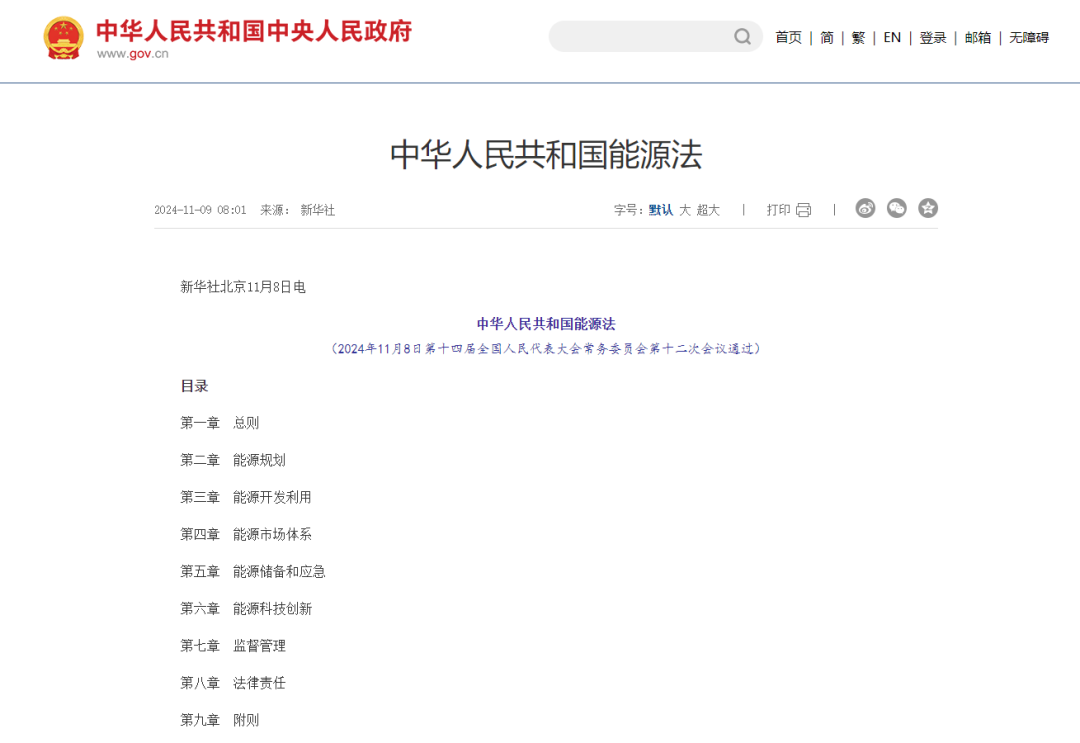 11月8日,十四届全国人大常委会第十二次会议表决通过《中华人民共和国能源法》。这部法律共九章,主要内容包括总则、能源规划、能源开发利用、能源市场体系、能源储备和应急、能源科技创新、监督管理、法律责任、附则等,自2025年1月1日起施行。